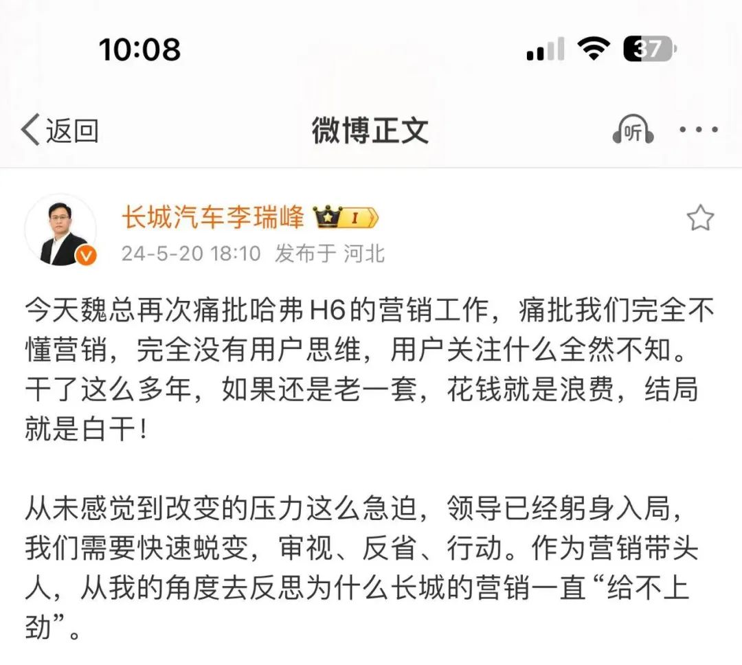 10日前,长城汽车首席增长官李瑞峰在微博上发文反思,称魏建军在一次内部会议上痛批了哈弗H6的营销工作,“完全不懂营销,完全没有用户思维,用户关注什么全然不知……”当天,赵永坡转发了这则微博,并评论:“哎!汗颜!”