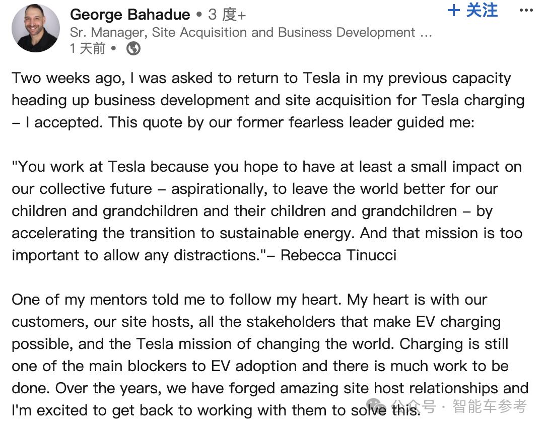 比如George Bahadue,之前是超充站场地选址和土地收购负责人,刚刚在领英上发文说自己“被邀请重回特斯拉担任相同的职务”,并且同意了。