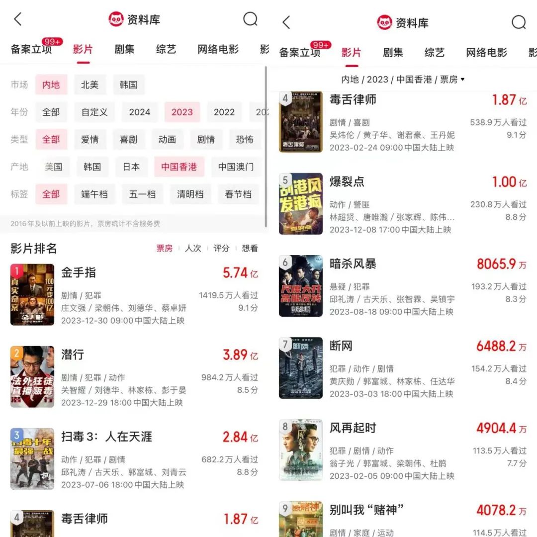 可自去年开始,港片却集体遇冷。票房最高的《金手指》耗资3.5亿,仅卖了5亿票房,恐有2亿以上亏损。港片的困境可能出在类型陈旧上,也可能是因为疫情三年积压了大量港片,去年集中向市场卸货,质量层次不齐,很容易让观众丧失辨别的耐心。