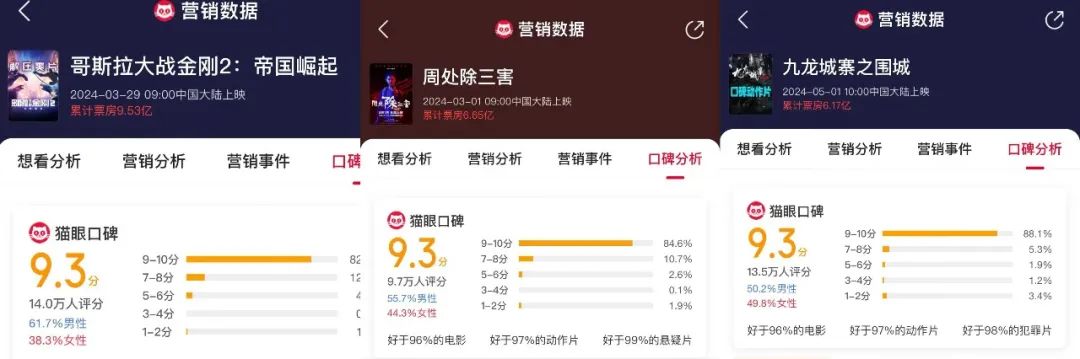 比如以前最管用的“想看”数据,票房转换率越来越低,有的甚至和票房没什么关系。去年猫眼上41万想看的《检察风云》、38万想看的《暗杀风暴》,都只卖了几千万票房。