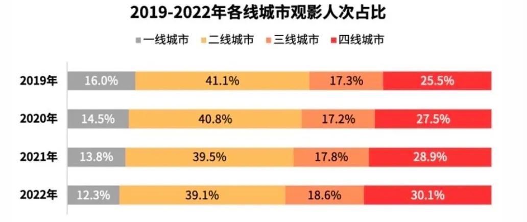 从2019年开始,每年一二线城市的观影人次占比都在下降。结合这两年的社会新闻,北上广大厂裁员潮、城市人口负增长等,就知道一二线城市的消费力恐怕不如从前。