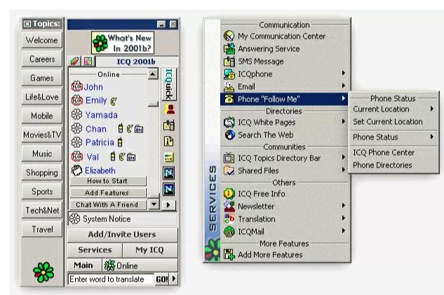 一方面,ICQ 面临的不止来自外部的压力,也有内部的压力。在 AOL 完全收购 ICQ 之前,该公司内部便在 1997 年发布了自己广受欢迎的 AOL Instant Messenger (AIM 即时通)。到 2000 年代中期,AIM 的“好友列表”功能让 AOL 占据了 IM 市场的一半以上。同时,AOL 购买了 ICQ 以后推出了更多功能的 99a、99b、2000 年等版本,但同时于 ICQ 内加插了广告,内建了搜索功能,让 ICQ 软件变得臃肿起来。