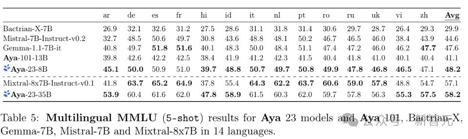 研究人员使用了不同模型在14种语言上的多语言机器学习理解(MMLU)基准上进行测试,选用的语言是Aya 23系列模型所支持的多语言MMLU测试语言的一个子集。