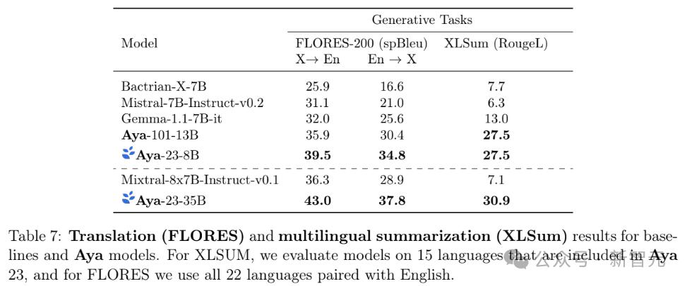研究人员还测试了Aya 23系列模型在23种语言与英语配对的翻译任务(FLORES),以及15种语言的摘要任务(XLSum)。