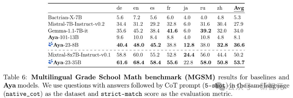 对于规模更大的模型,Aya-23-35B模型以53.7分的成绩超过了Mixtral-8x7B-Instruct-v0.1模型的50.2分。