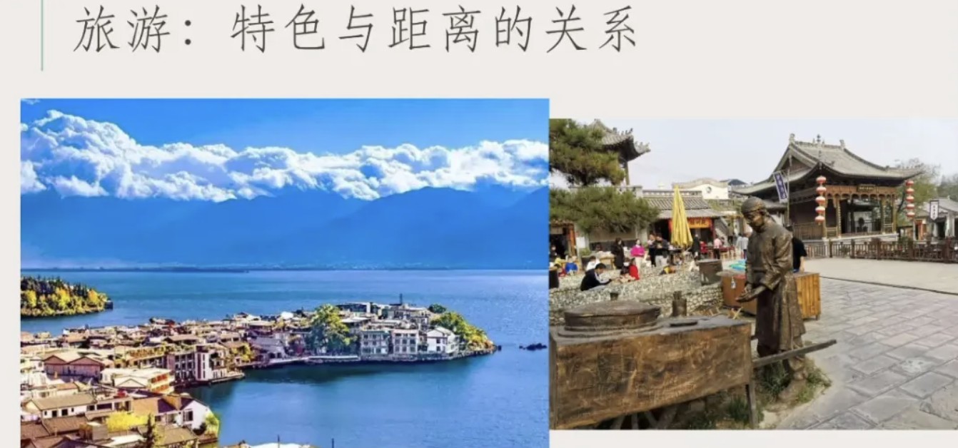 讨论完农业之后,让我们转向旅游业。目前,中国许多偏远地区和人口流出的地方非常适合发展以生态和自然环境为基础的旅游产业,发展关键在于要处理好特色与距离的关系。地理位置越偏远,旅游项目越需要具有独特性,这样才能吸引来自全国乃至全世界的游客。同时,避免同质化是至关重要的。要避免右下图显示的情况。这是西部某省的一处特色小镇,如果不了解背景,人们可能会误以为它位于绍兴。这种类型的投资没有充分利用当地的地理和文化优势,事先出现的是游客廖廖,回报不足。