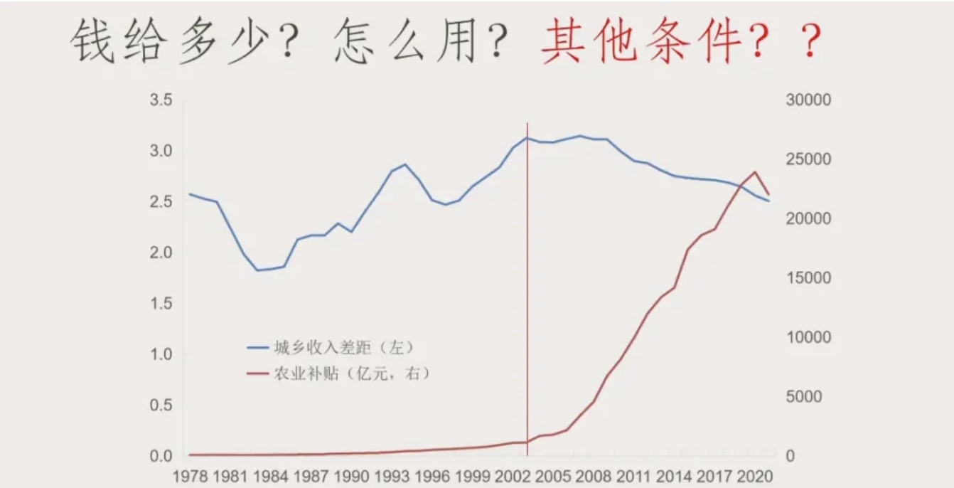 图中(红线)显示的是农业补贴的增长和(蓝线)城乡收入差距的变化。从2003年开始,城乡收入差距不再进一步扩大。随着时间的推移,特别是在2009年之后,城乡收入差距进一步缩小。在已经实现了一定程度的收入均等化和公平分配的情况下,我们需要进一步探讨的问题是:是否存在公平与效率之间的冲突?资金应该如何更有效地使用?在提供资金支持的同时,是否还需要配合其他条件?这些问题将是接下来讨论的重点。