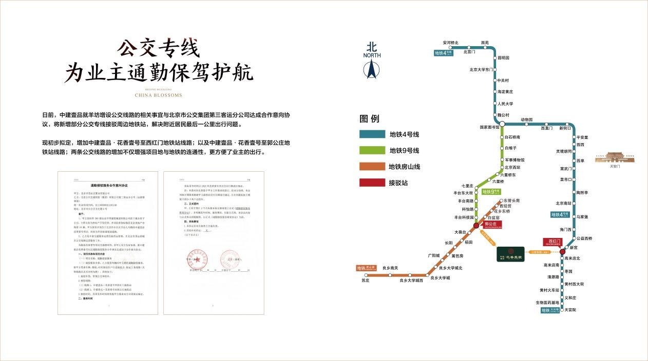 为方便业主出行,中建壹品就花香壹号增设公交线路与北京市公交集团第三客运分公司达成合作意向协议,将新增部分公交专线接驳周边地铁站,解决小区居民最后一公里出行问题。现初步拟定,增加中建壹品·花香壹号至西红门地铁站线路,以及中建壹品·花香壹号至郭公庄地铁站线路。两条公交线路的增加不仅增强项目地与地铁的连通性,更方便了业主的出行。(具体以区域公交线路规划及落实情况为准,实际用车时间以2026年花香壹号项目交付日期进行确认)