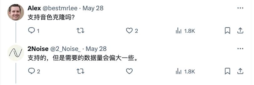 2Noise 称,目前支持音色克隆,但需要更大的数据量。