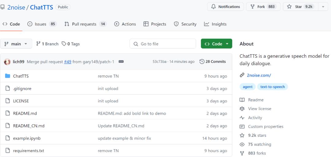 项目地址:https://github.com/2noise/ChatTTS/tree/main