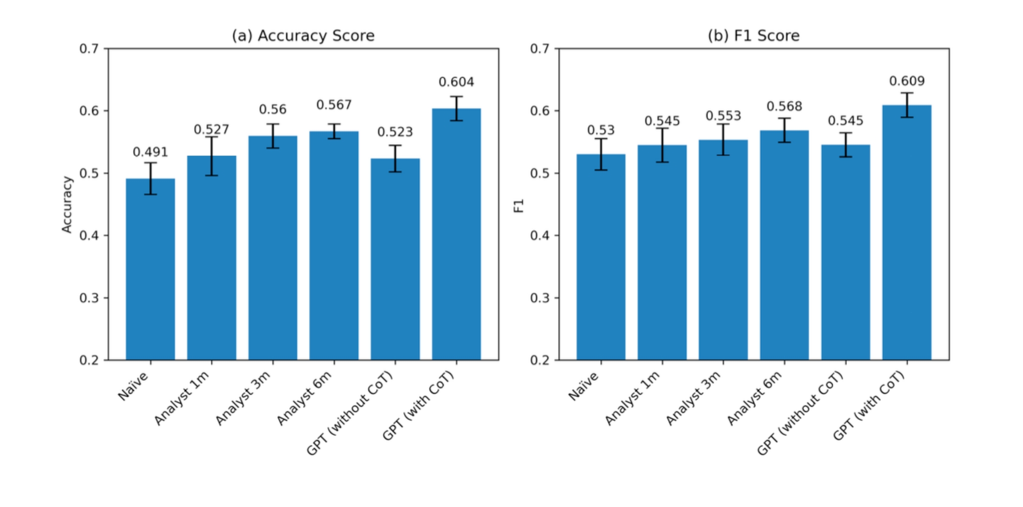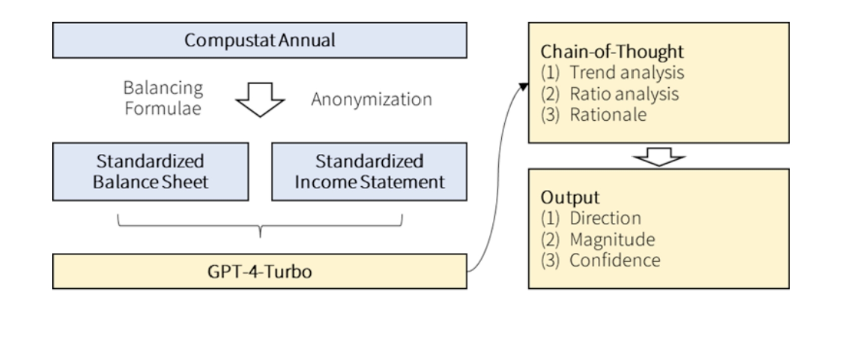 研究人员测试了OpenAI研发的最先进大模型 GPT-4 通过分析公司财务报表来预测未来收益增长的表现。值得注意的是,哪怕只提供标准化、匿名的资产负债表和没有任何文本背景的损益表,GPT-4 也能够胜过人类分析师。