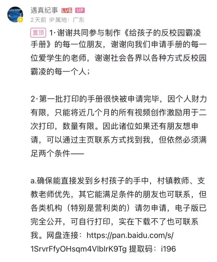 在B站,他也免费公开了这份手册的电子版,呼吁更多人转发、分享给身边的孩子。