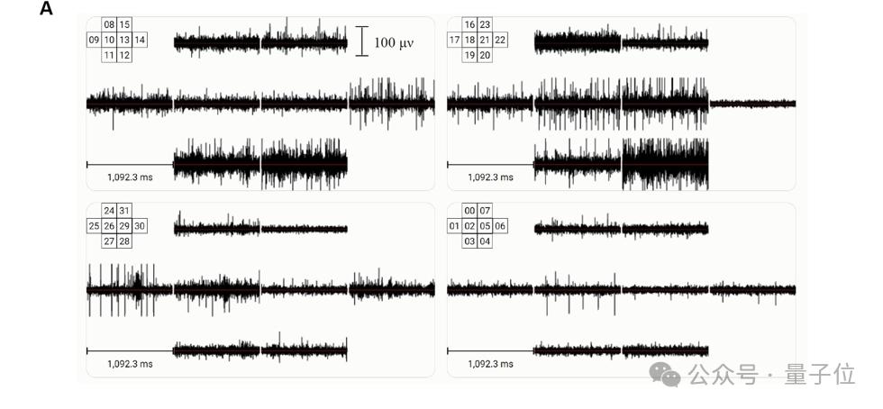 每个MEA拥有四个类器官,通过用于刺激和记录的八个电极连接。数据通过数字-模拟转换器(Intan RHS 32控制器)来回传输,采样频率为30kHz,分辨率为16位。