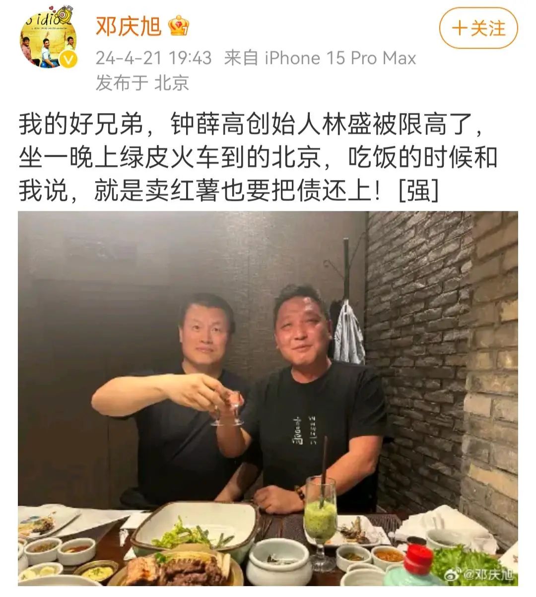 今年4月,新浪财经CEO邓庆旭发了一条微博,表示钟薛高创始人林盛被限高了,但坐了一夜绿皮火车到北京和他见面,“就是卖红薯也要把债还上”,随后又补充林盛直言自己“不跑不赖不怂”。