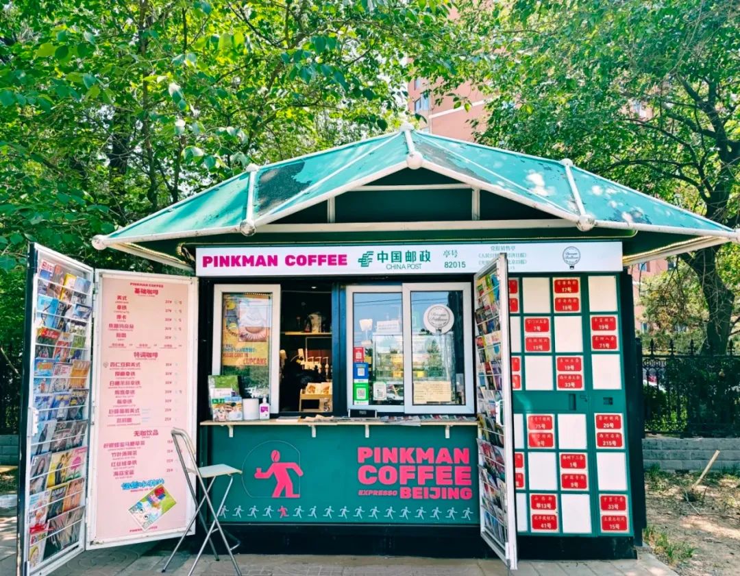 “PINKMAN COFFEE(粉人咖啡)”是一家位于北京石景山区的咖啡报亭,店名来自美剧《绝命毒师》中男主角Jesse Pinkman的英文名。报刊亭外摆放着常见的报纸杂志,亭里则是一个咖啡制作间,窗口外还放了张椅子供客人休息。