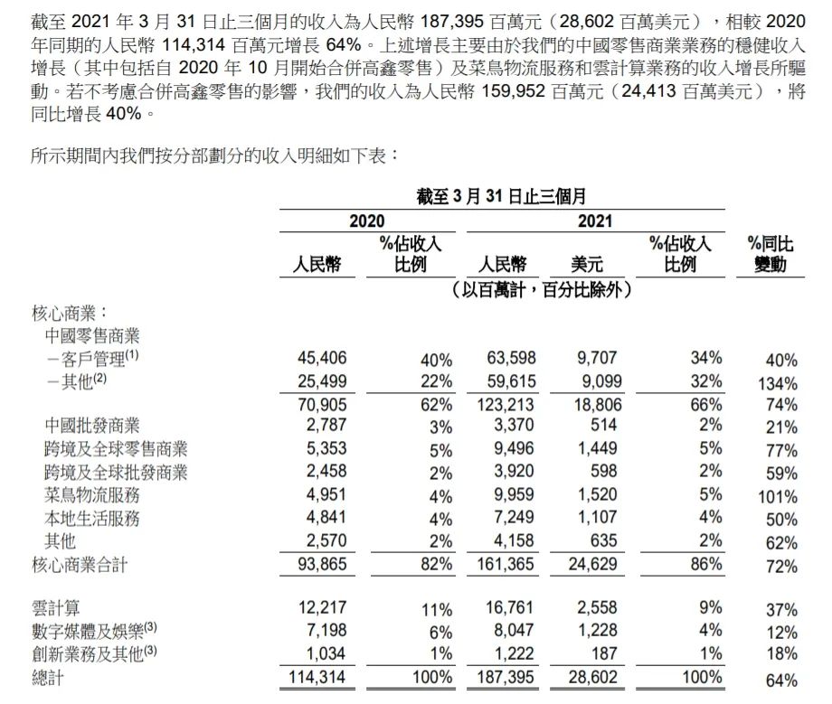 大润发对阿里的贡献,也能直观地体现在财务上。在2021年高鑫零售并表后的第一个季度财报中显示,高鑫零售一个季度就为阿里总营收贡献了近300亿,也因此让阿里的季度营收同比增长了6 4%,如果不考虑合并高鑫零售的影响,其增速仅为40%。