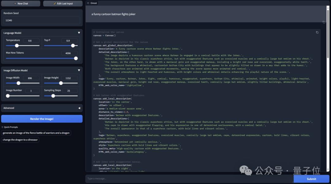 目前,Omost用来生成代码的LLM有基于Llama3和Phi3变体的三种模型,Lvmin Zhang还放出了Demo大伙儿可以试玩。