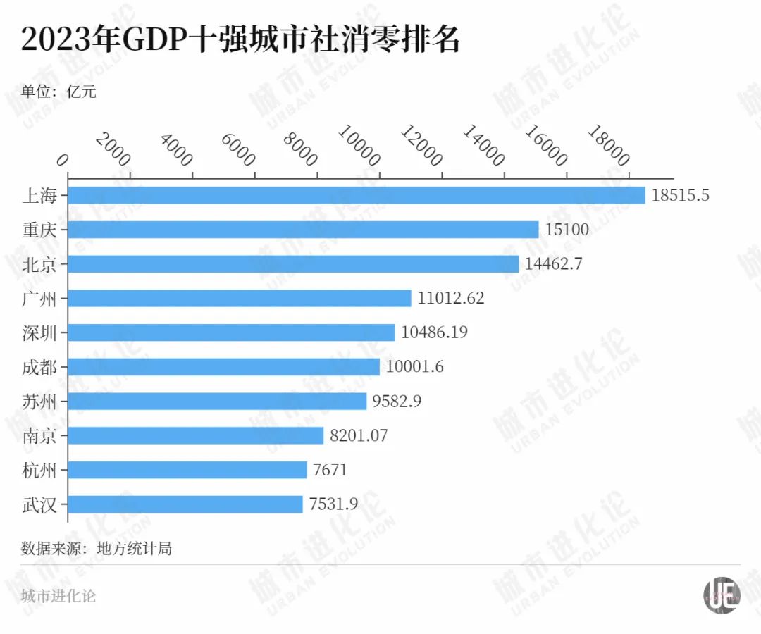 2023年,全国已有6座城市社会消费品零售总额超过万亿元。其中,GDP前五强城市——上海、重庆、北京、广州、深圳全部在列,GDP排名第七的成都也先一步跨过万亿门槛,“经济第六城”苏州却仍在等待晋级。