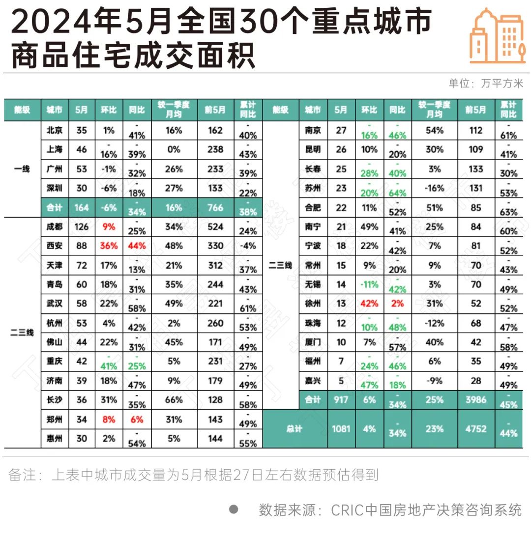 CRIC数据显示5月30个重点城市整体成交1081万平方米,环比增长4%,较4月小幅微增,与一季度均值相比,增长23%。