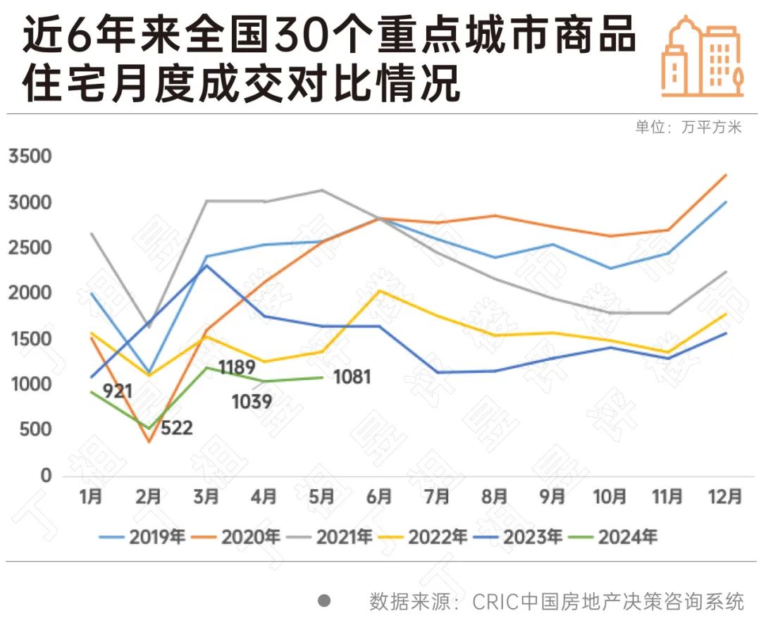 不仅是上海,从CRIC重点监测的30个城市来看,2024年5月30个重点城市整体成交1081万平方米,环比增长4%,同比下降34%,与一季度均值相比增长23%。前5月累计同比降44%,降幅收窄2个百分点。