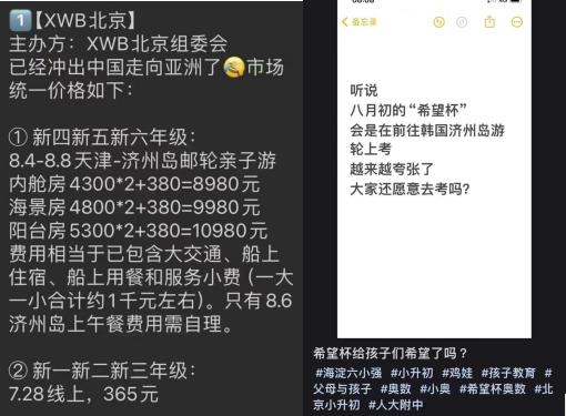 尽管自2018年起,教育部门多次发文禁止一些学前教育、小升初阶段的“违规竞赛”,但近期有一群自称学生家长的人在社交媒体上反映,收到了小学生奥数比赛“希望杯”的比赛邀请,但考试是在一条邮轮上,还要经过公海去往韩国。