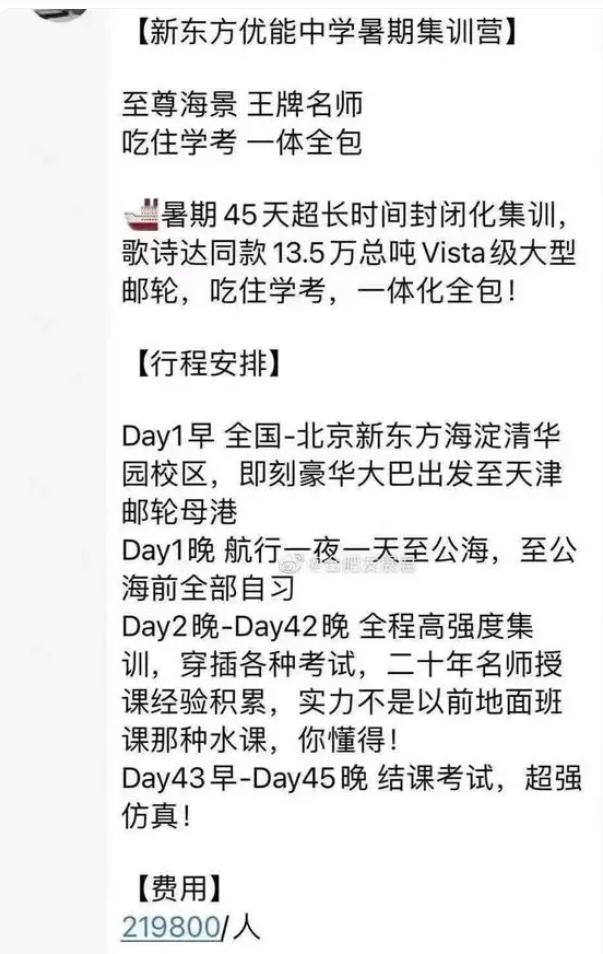 2021年7月,“双减”政策刚刚落地,一张邮轮“新东方优能中学暑期集训营”的微信聊天图片火了,大意是邮轮开到公海,在邮轮上举办暑期45超长时间强化集训班,王牌名师,吃住全包,费用为219800/人。