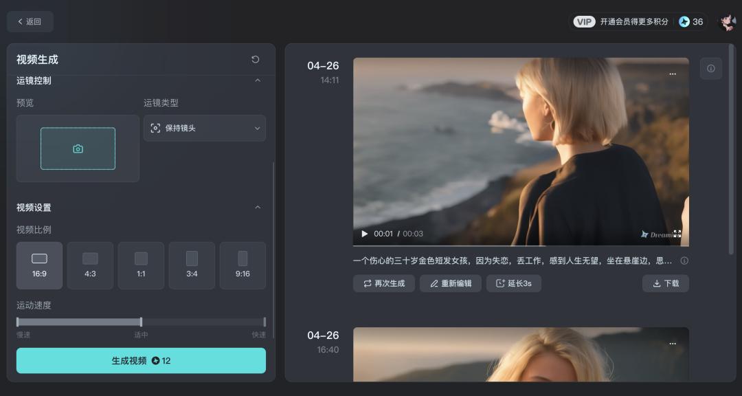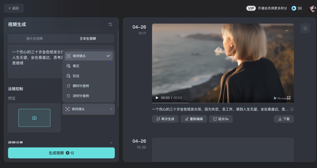 可以看到在生成视频下方有三个创作选项:再次生成、重新编辑和延长 3 秒。再次生成同样需要花费 12 积分。延长 3 秒要开通 69 元的月度 VIP 才可以。