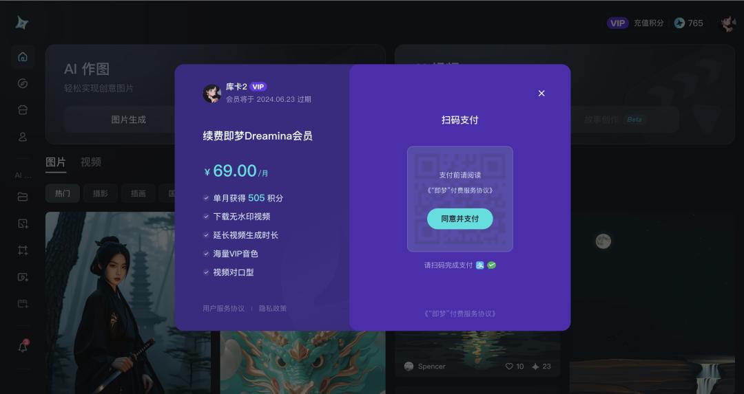 69 元的会员权益包括单月 505 积分,下载无水印视频以及延长视频生成时长、第多种音色以及视频对口型。