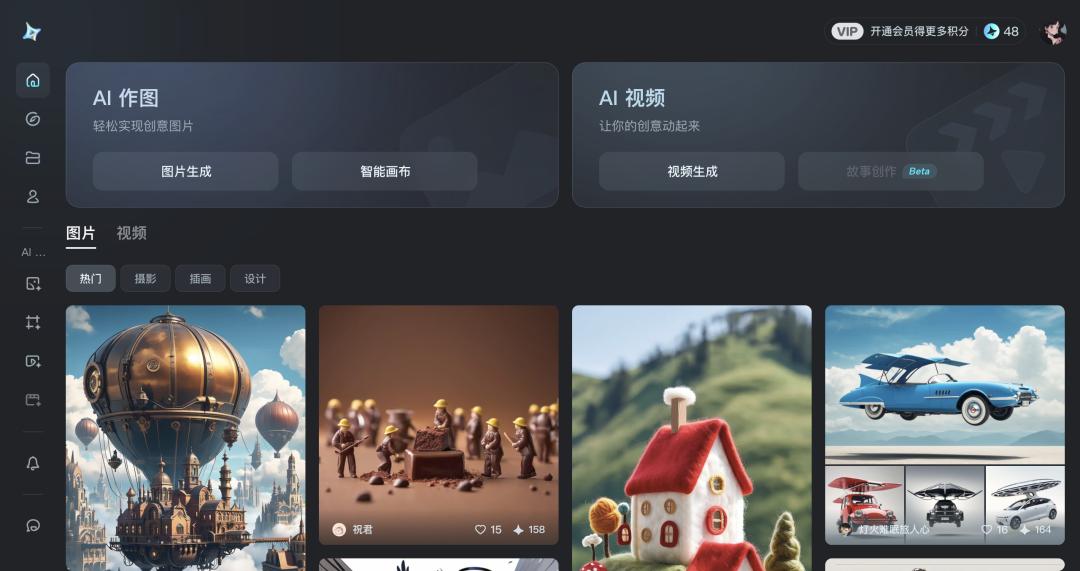 不过从侧边栏看,AI 工具有:图片生成、智能画布、视频生成以及尚未开通的故事创作四项。