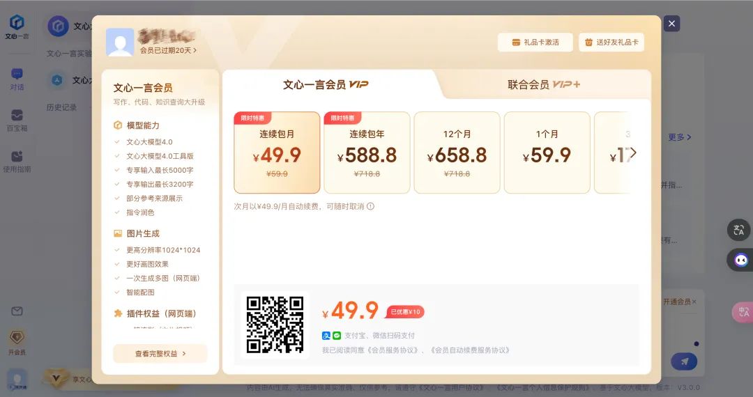 文心一言的会员价格|图片来源:极客公园