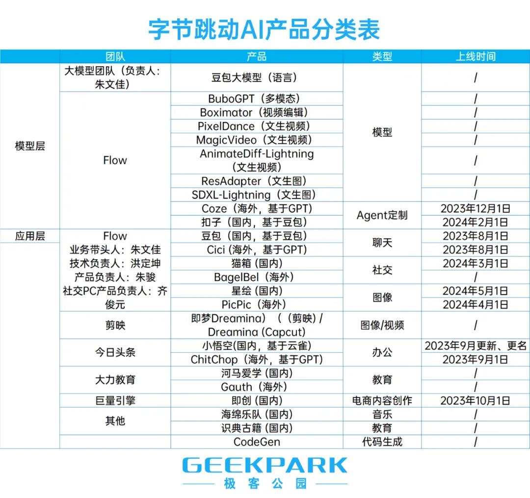如下图所示,极客公园对字节跳动目前的 AI 产品进行了分类整理: