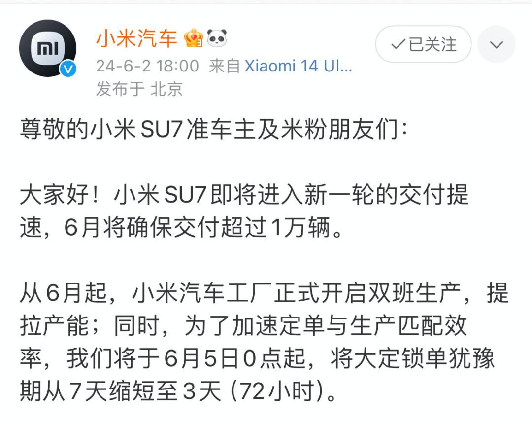 就在6月2日,小米汽车通过官方微博发布消息,小米SU7即将进入新一轮的交付提速,6月将确保交付超过1万辆。同时,为了加速定单与生产匹配效率,将于6月5日0点起,将大定锁单犹豫期从7天缩短至3天。