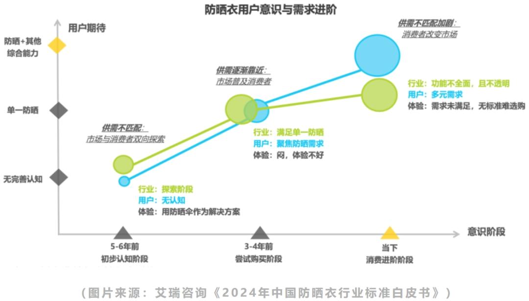 与此同时,消费者对防晒衣的需求也在逐步进阶。5-6年前,在国内防晒衣行业的起步和探索阶段,消费者对防晒衣还没有足够的认知,更多倾向于选择防晒霜、遮阳帽、防晒伞等防晒措施,且当时市面上的防晒衣功能主要聚焦在防晒性能上,透气性、美观度都有所欠缺,消费者整体穿着体验不佳。