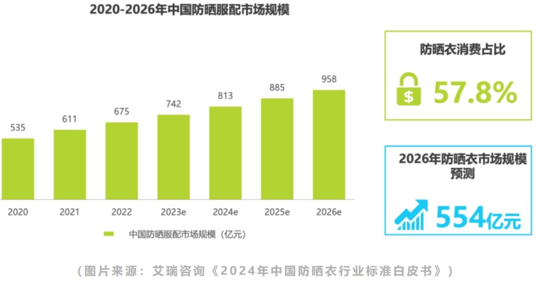 对“硬防晒”的追求已催生出了数百亿的市场规模。根据艾瑞咨询的研报数据,在中国防晒服配市场规模中,防晒衣消费占比超过50%,到2026年,中国防晒服配市场规模将达到958亿元,其中防晒衣市场规模预测将达到554亿元。