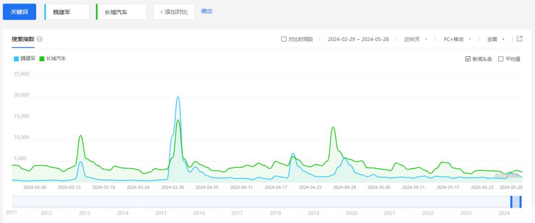 在百度搜索指数显示的数据中,近期“魏建军”和“长城汽车”的几次搜索高峰,均呈现高度正相关。这证明了董事长的带货能力。