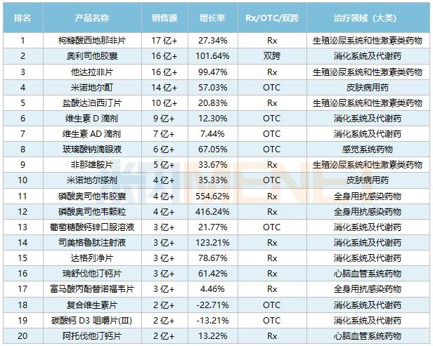 在TOP20中,他达拉非片、盐酸达泊西汀片也分别排名第三、第五。