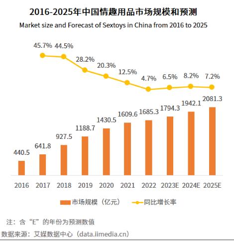 iiMedia Research(艾媒咨询)数据显示,2023年、2024年情趣用品市场规模增速将达到6.5%、8.2%,预计2025年市场规模有望达到2081.3亿元。