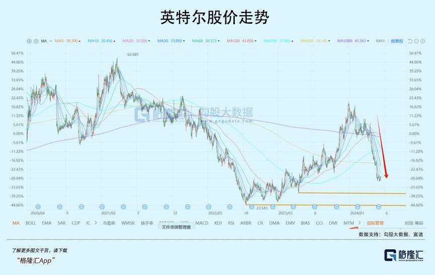 比如下面这家芯片巨头英特尔,从去年底的高位到现在跌幅高达40%,如果从2021年的高位算下来,已经腰斩。