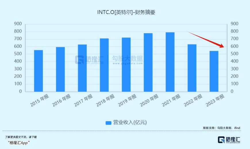 第一是营收在减少 ,2021年,英特尔营收为790亿美元,但到了2022年,减少到630亿,降幅超过20%。而到2023年,进一步降低至542亿美元,虽然跌幅略微收窄到14%,但两年的下滑幅度依然很惊人。