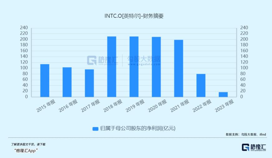 看看英特尔的财务就知道了,2021年的时候,英特尔一年的净利润还有198亿美元。到2022年,跌到80亿美元,2023年,就只有16亿美元,年均下滑速度将近-70%。