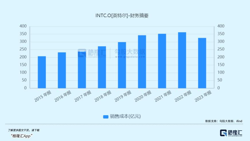 其次,是成本大幅上升 。销售成本整体变化不大,2022年还比2021年上升近10亿,2023年也只是比前一年下降了36亿,明显不及营收的下降速度,因此毛利率被拖累。2023年,英特尔的毛利率只有217亿,只有2021年的一半。