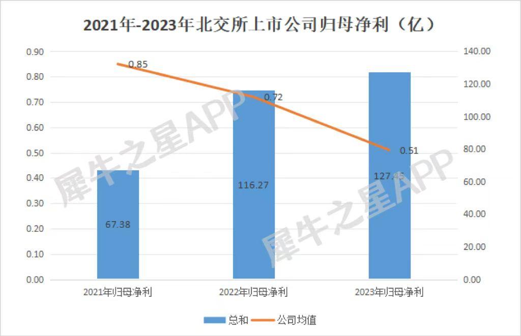 从利润角度来看,北交所公司总利润从2021年的67.38亿元增长至2023年的127.45亿元,两年时间利润翻番,但对比企业数量2倍的增长以及营收规模约1.8倍的增长,总利润增幅相对较小。