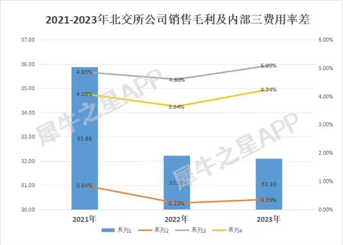 从费率角度来看,近三年来北交所内公司销售毛利率持续下滑,但销售、管理、财务费则都较2022年前都有所上升。