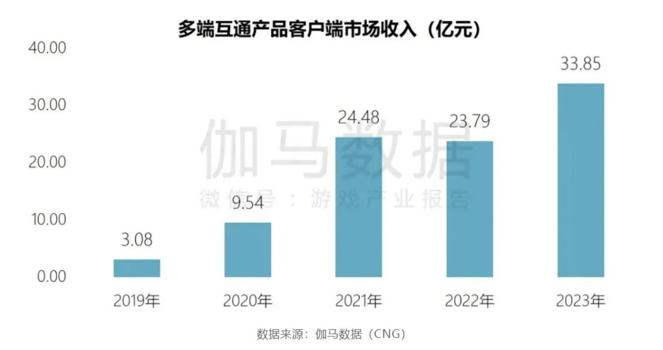 5月30日,伽马数据发布《客户端游戏市场营销发展报告》,涉及了多个跨平台数据。2023年多端互通产品PC端收入33.85亿元,五年增长约10倍,2023年84款PC端跨平台版号通过审批,同比增长282%。
