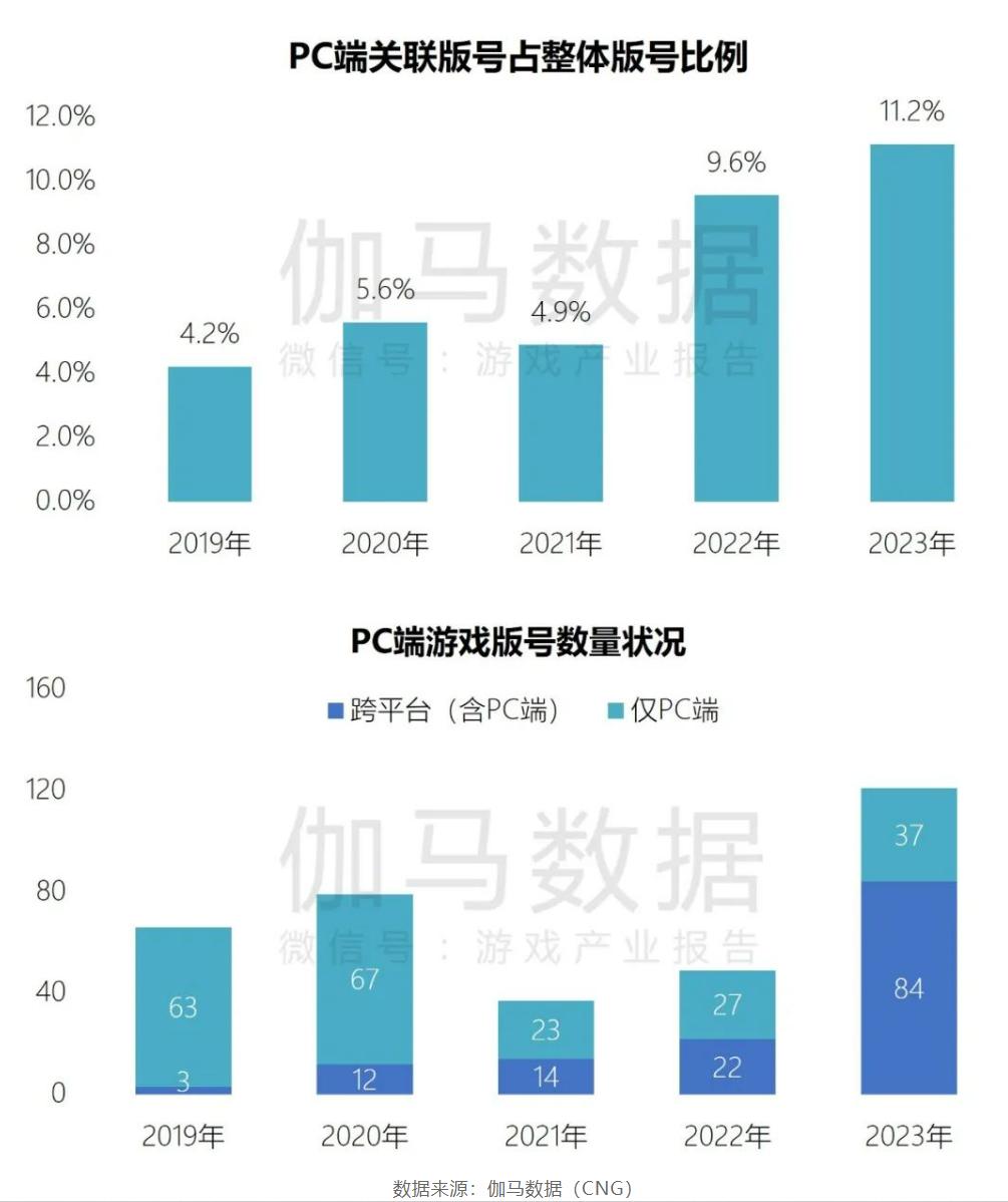 此外市场环境方面,随着游戏行业不断规范化发展,版号的发放常态化且有上升趋势。 2022 、 2023 年 PC 端关联版号占整体版号比例大幅上涨,其中 PC 端跨平台版号数量的上升是推动 PC 版号数量上升的重要原因 , 2023 年跨 PC 版号超过了仅 PC 端的两倍有余。