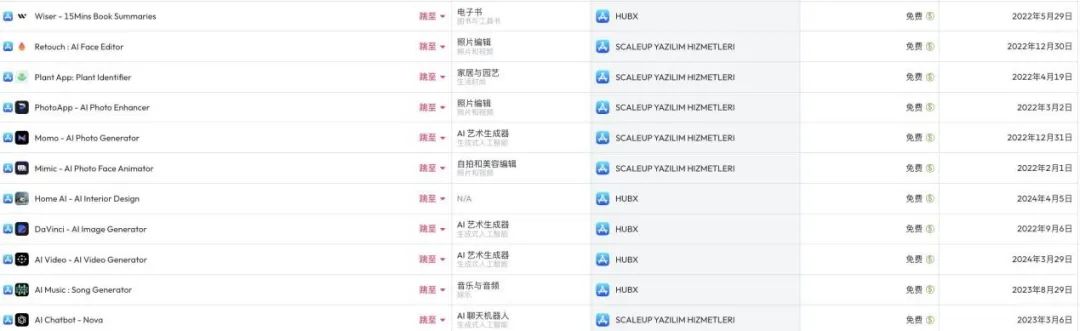 从公司层面来看,这 8 款产品来自 4 家土耳其公司。其中,我们以各有三款产品上榜的 Codeway 和 HubX 为例来观察。在 iOS 端的开发者产品列表来看,两家公司一共 27 款产品中,只有 5 款产品是与 AI 无关的工具,两家公司的含 AI 量都比较高。