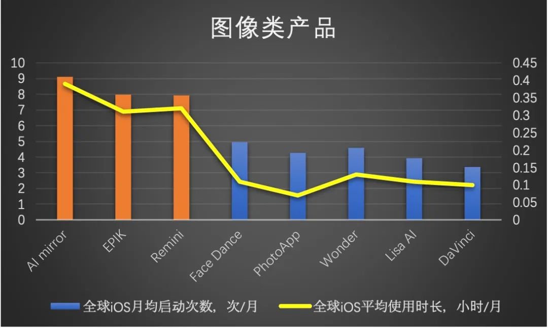 AI 图像产品有 5 款。其中 Wonder、DaVinci 和 LisaAI 是以文生图、AI 头像等为核心功能的生图产品。PhotoApp 是一款包括了照片增强、背景消除功能的 AI 修图产品。而 Face Dance 是一款娱乐向的 AI 换脸+搞笑视频生成产品。
