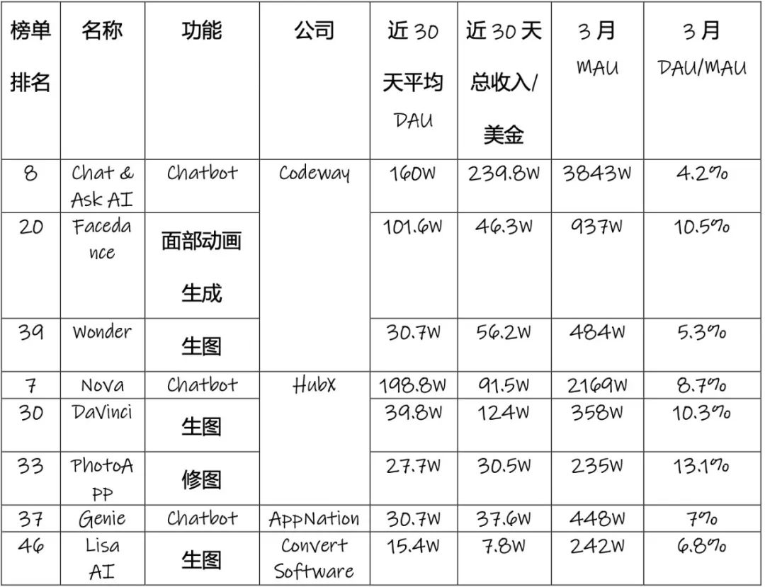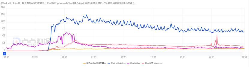在 2023 年 5-6 月收入达到顶峰后,这些 AI Chatbot的收入均出现了下滑|图片来源:点点数据