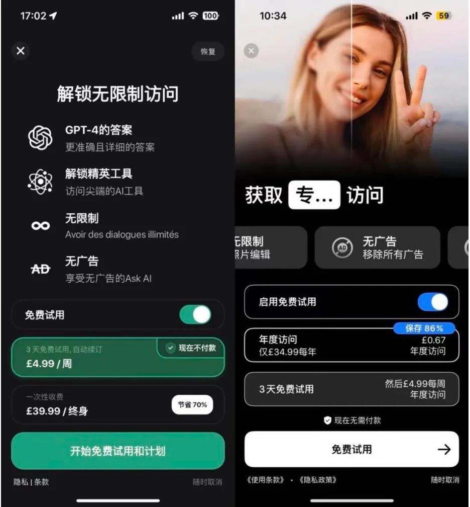 Chat & Ask AI(左),PhotoApp(右)订阅页面