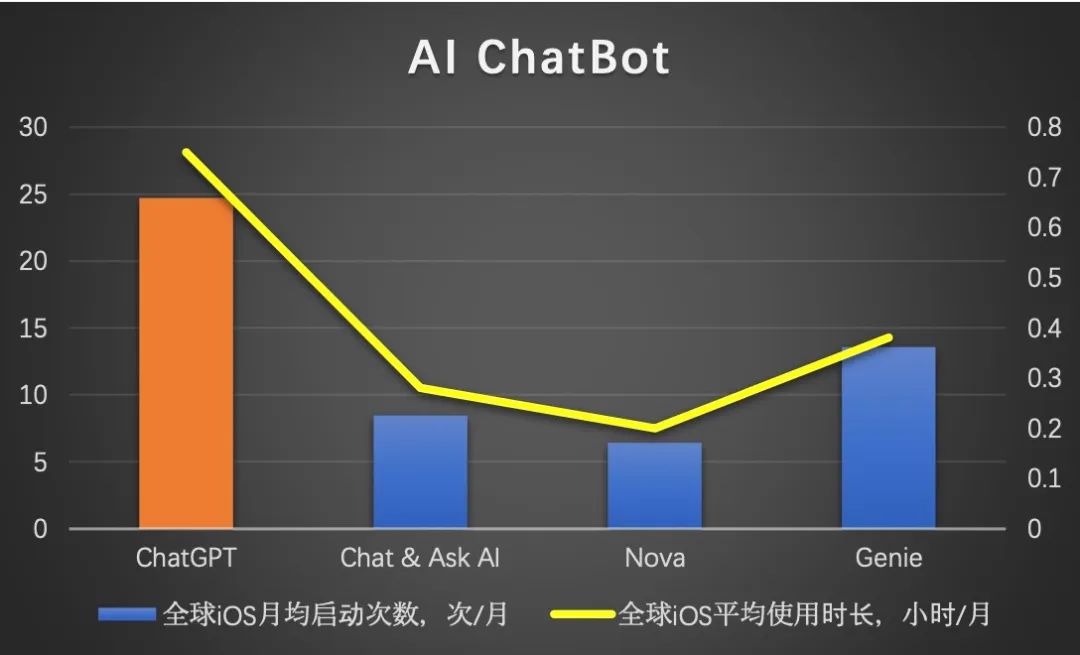当笔者把月启动次数和平均使用时长数据进行分类对比之后发现,这些产品基本都低于同样登上 a16z 榜单的同类头部产品,而且差距明显。结合笔者的使用体验,这些产品要么是纯套壳,要么是在开源模型的基础上融入一些其他功能,且质量也不突出。所以具体到一些使用数据上,这些产品的表现差强人意。